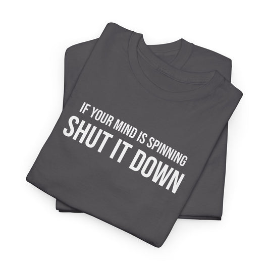 Men Heavy Cotton Tee – ‘If Your Mind is Spinning, Shut it Down’ | Mental Strength, Relaxation, and Wellness Shirt